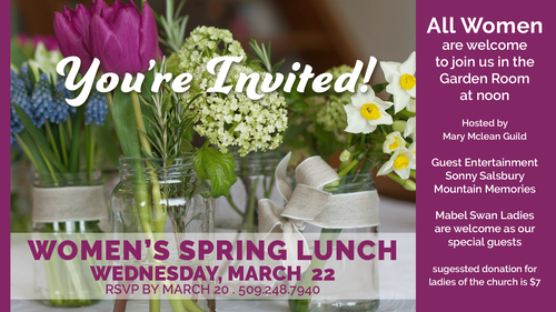 All women are welcome to join us in the Garden Room of Grace of Christ at noon, Wednesday, March 22.